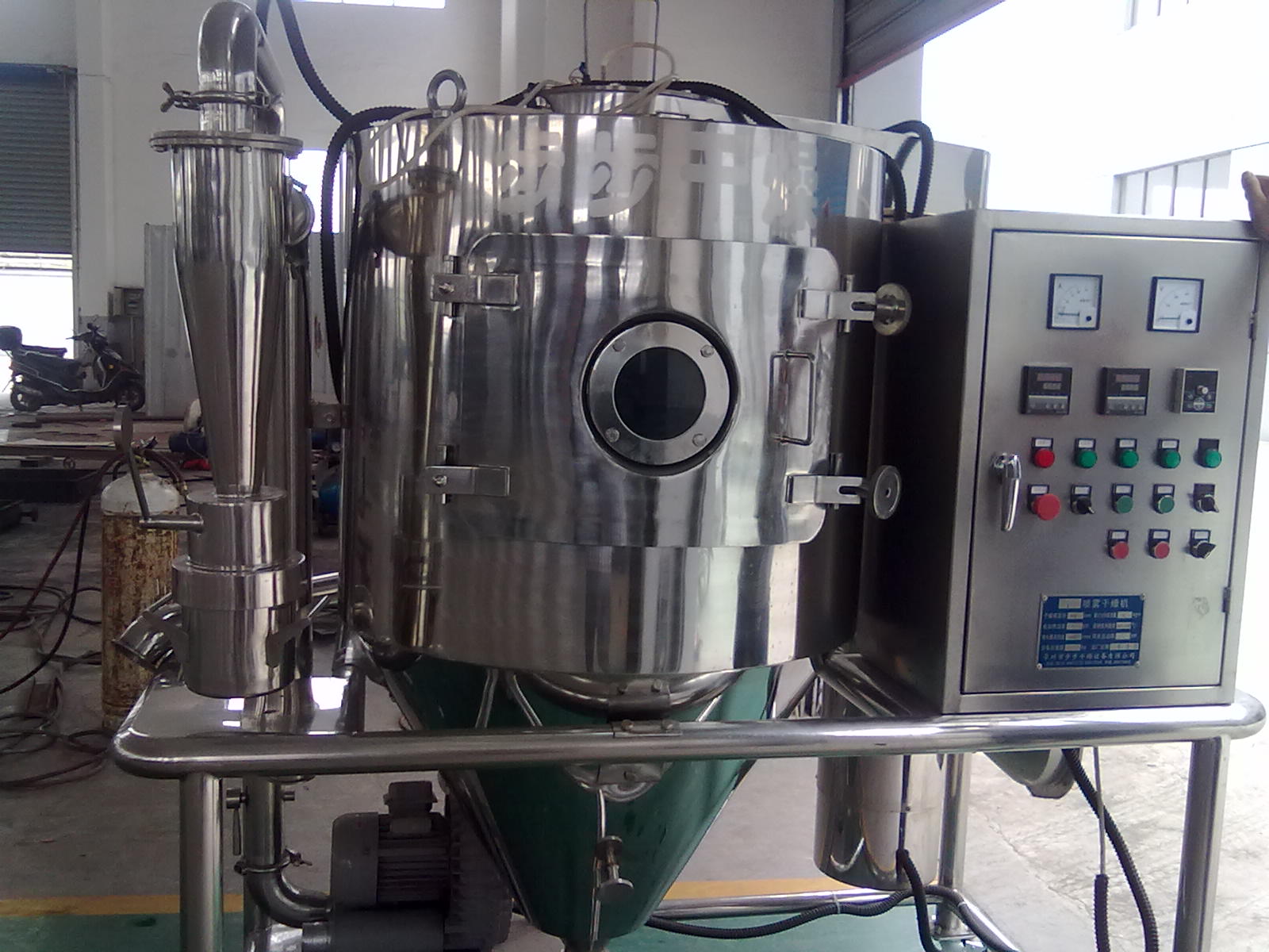 本機是利用高速離心式霧化器使物料分散成霧狀,與熱空氣充分接觸完成瞬間干燥,形成粉狀成品的干燥裝置。空氣先經過初效、中效過濾器,由加熱器加熱后入